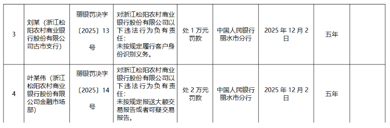 刘某,浙江松阳农村商业银行古市支行,因对“未按规定履行客户身份识别义务”负有责任,被处罚款1万元;