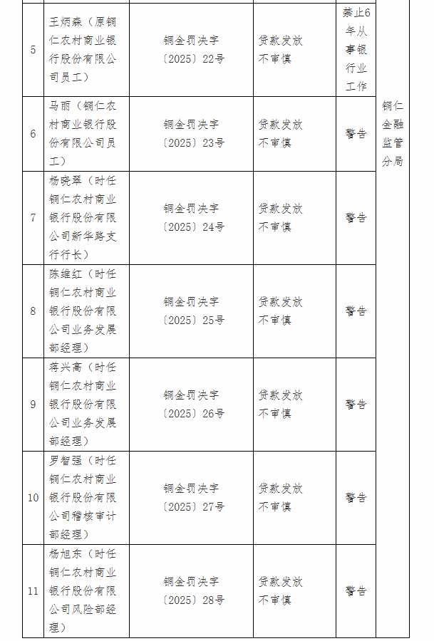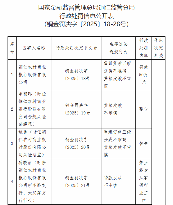 铜仁农商行因"重组贷款五级分类不准确、贷款发放不审慎"被处以50万元罚款。