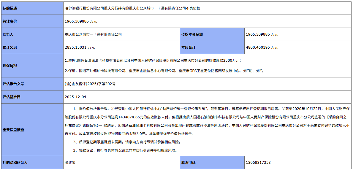 该债权本金约 1965.31 万元,累计欠息约 2835.15 万元,本息合计超 4800 万元,转让底价与本金金额一致,相当于4折抛售。