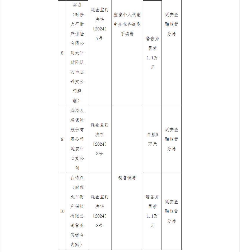 海港人寿保险股份有限公司延安中心支公司因“销售误导”被罚9万元,时任太平财产保险有限公司营业区综合内勤白海江被警告并罚款1.1万元。