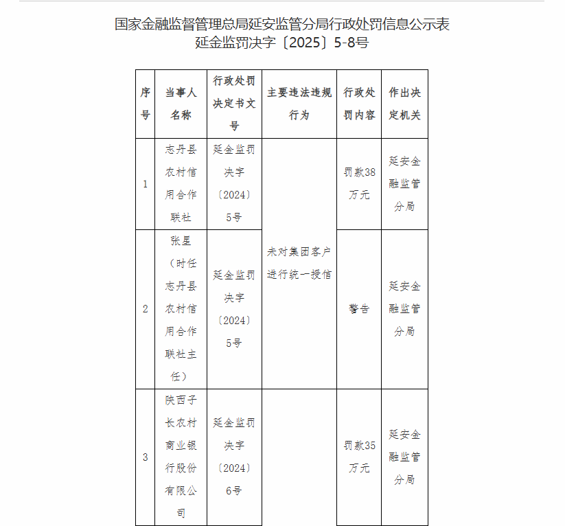 志丹县农村信用合作联社因“未对集团客户进行统一授信”被罚38万元,时任该联社主任张星被警告;