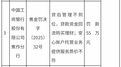 中国工商银行股份有限公司焦作分行因“贷后管理不到位,贷款资金回流购买理财;安心账户托管业务提供服务质价不符”被罚款55万元;