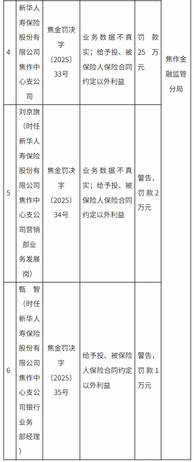 新华人寿保险股份有限公司焦作中心支公司因“业务数据不真实;给予投、被保险人保险合同约定以外利益”被罚款25万元;时任该公司营销部业务发展岗刘京旗被警告并罚款2万元;时任该公司银行业务部经理甄智因被警告并罚款1万元。