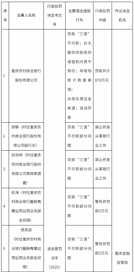 重庆农村商业银行股份有限公司因“贷款‘三查’不尽职;对大额风险损失的调查和问责不到位;非现场统计数据差错;未核实保证金来源;滚动开票”被罚款870万元;