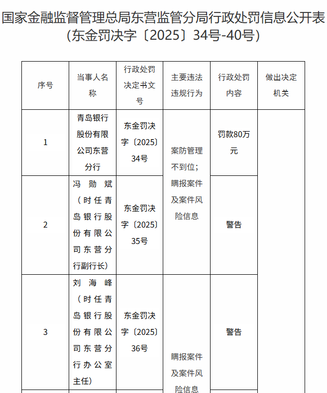 财韵洞察网||2026年1月7日,国家金融监督管理总局东营监管分局对青岛银行股份有限公司东营分行开出罚单(东金罚决字〔2025〕34 号 - 40 号)。