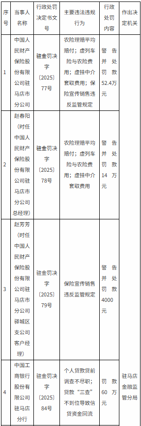 具体来看,人保财险驻马店市分公司存在农险理赔平均赔付、虚列车险与农险费用、虚挂中介套取费用、保险宣传销售违反监管规定等问题,被警告并罚款52.4万元;时任该公司总经理赵春阳因参与农险理赔、费用虚列等违规行为,被警告并罚款14万元;时任驿城区支公司客户经理赵芳芳因保险宣传销售违规,被警告并罚款4000元。