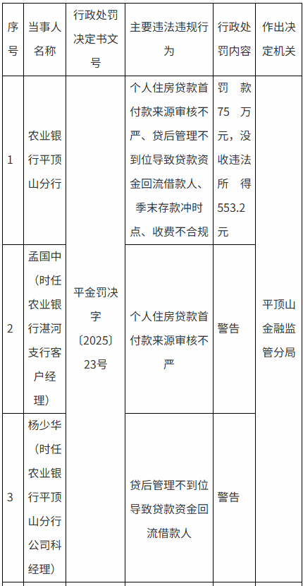 具体来看,农业银行平顶山分行因个人住房贷款首付款来源审核不严、贷后管理不到位致贷款资金回流借款人、季末存款冲时点、收费不合规,被罚款75万元并没收违法所得553.2元,时任湛河支行客户经理孟国中、分行公司科经理杨少华分别被警告;