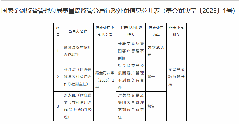 昌黎县农村信用合作联社因关联交易及集团客户管理不到位,被处以30万元罚款,时任该联社副主任张江涛、部门经理刘永红因负有相关责任,均受到警告处罚(处罚文号:秦金罚决字〔2025〕1 号)。