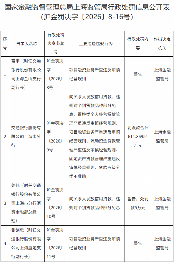 财韵洞察网||国家金融监督管理总局上海监管局近日对交通银行股份有限公司上海市分行开出重磅罚单,罚没款合计611.87万元,同时对该分行及辖内支行8名时任负责人处以行政处罚。
