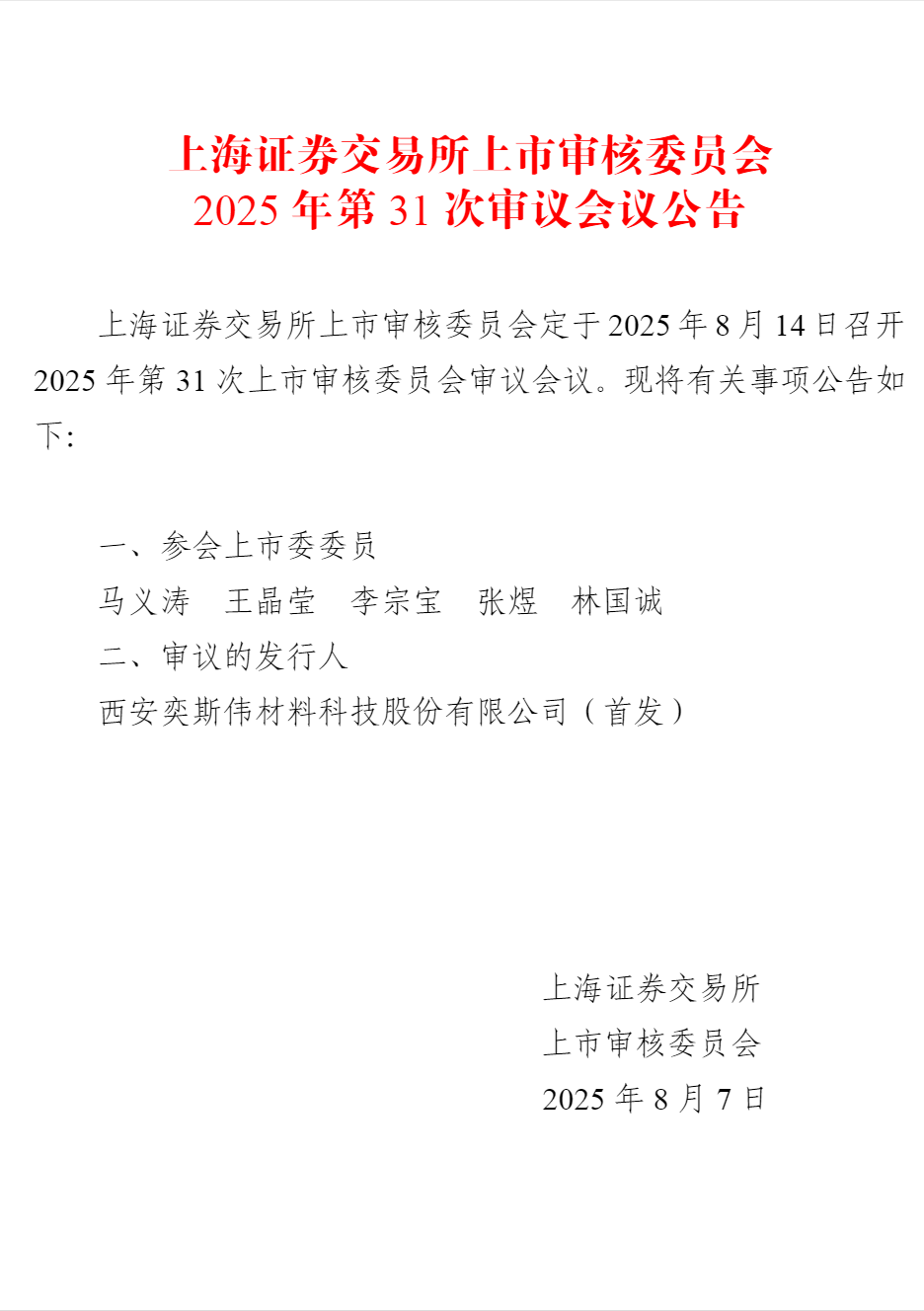 8月7日晚间,上交所上市委公告,西安奕斯伟材料科技股份有限公司将于2025年8月14日上会审议。据了解,西安奕材专注于12英寸硅片的研发、生产和销售。